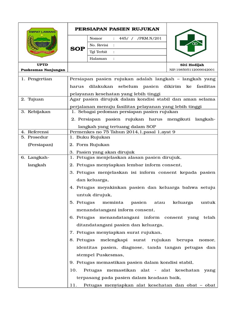 Far more strategy for the purpose of sop rujukan sampel resume klinis pasien yang dirujuk is sop persiapan pasien rujukan SOP / CARA RUJUKAN PASIEN Pengertian. 1. Pasien Dirujuk adalah pasien yang atas pertimbangan dokter / perawat / bidan memerlukan pelayanan di RS baik untuk diagnostik penunjang atau terapi. Tujuan. Sebagai acuan penatalaksanaan pengantaran rujukan sampai rumah sakit tujuan dengan cepat dan aman.