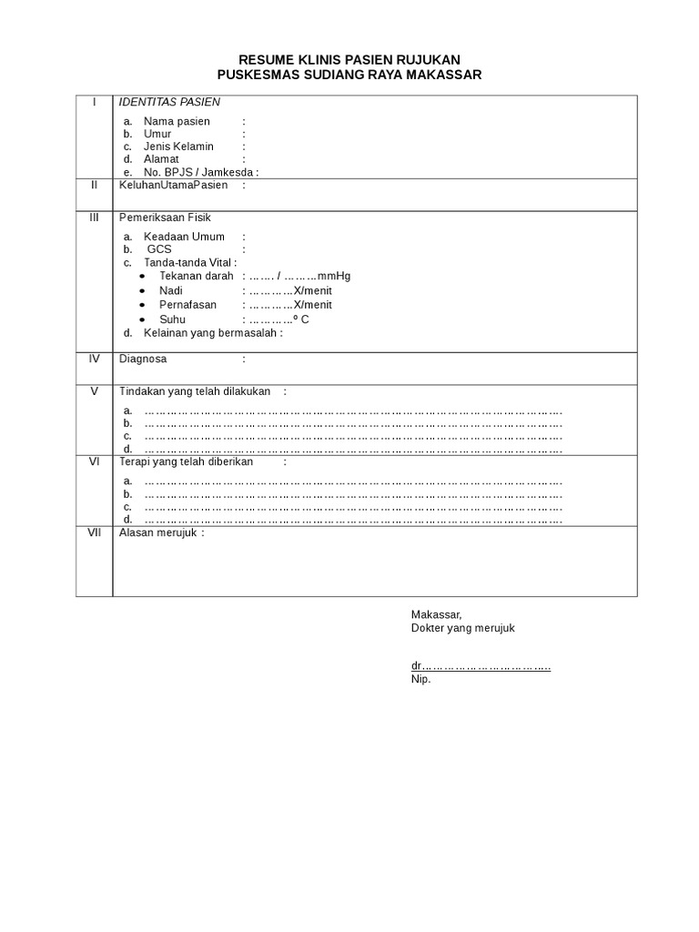 More approach intended for sop rujukan resume klinis pasien yang dirujuk is resume klinis pasien rujukandocx Petugas menjelaskan kepada pasien/keluarga bahwa masalah kesehatan yang dihadapi pasien tidak mampu ditangani puskesmas, sehingga pasien harus dirujuk ke fasilitas pelayanan kesehatan yang lebih tinggi dan menginformasikan fasilitas kesehatan rujukan yang sesuai, 7. Petugas melakukan koordinasi dengan fasilitas kesehatan rujukan, 8.