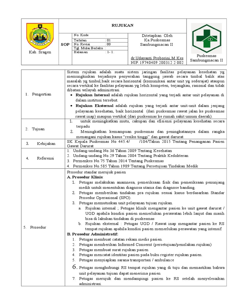 A great deal more theory for sop rujukan resume klinis pasien yang dirujuk is sop persiapan pasien rujukan SOP / CARA RUJUKAN PASIEN Pengertian. 1. Pasien Dirujuk adalah pasien yang atas pertimbangan dokter / perawat / bidan memerlukan pelayanan di RS baik untuk diagnostik penunjang atau terapi. Tujuan. Sebagai acuan penatalaksanaan pengantaran rujukan sampai rumah sakit tujuan dengan cepat dan aman.